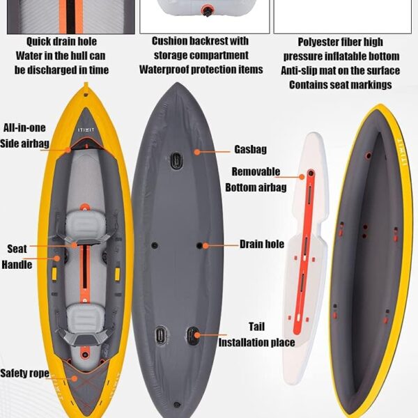 ابعاد مناسب این قایق، فضای کافی برای نشستن و جابهجایی تجهیزات را فراهم میکند و در عین حال پس از تخلیه باد، به اندازهای جمعوجور میشود که بهراحتی در کیف یا صندوق خودرو قابل حمل باشد. وزن 16 کیلوگرمی آن در مقایسه با قایقهای سخت، حمل و نقل آسانتری را فراهم میکند و برای سفرهای کمپینگ و طبیعتگردی بسیار کاربردی است.